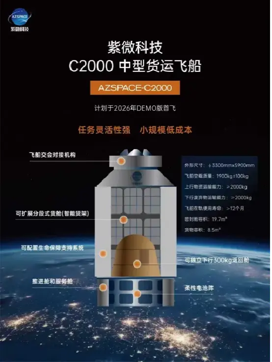 根据协议内容,紫微科技将在成都经开区投资建设研发制造基地。基地核心任务聚焦两款核心航天产品研制,一是C2000中型货运飞船,设计运载能力达2000公斤,主要承担空间站货物补给、下行返回及在轨构建商业空间站等任务;二是轨道转移飞行器,重点突破在轨加注、交会对接等关键技术。项目以航天器整船研制为核心,将构建覆盖关键部件研制、系统集成、试验验证到空间应用服务的完整产业生态。